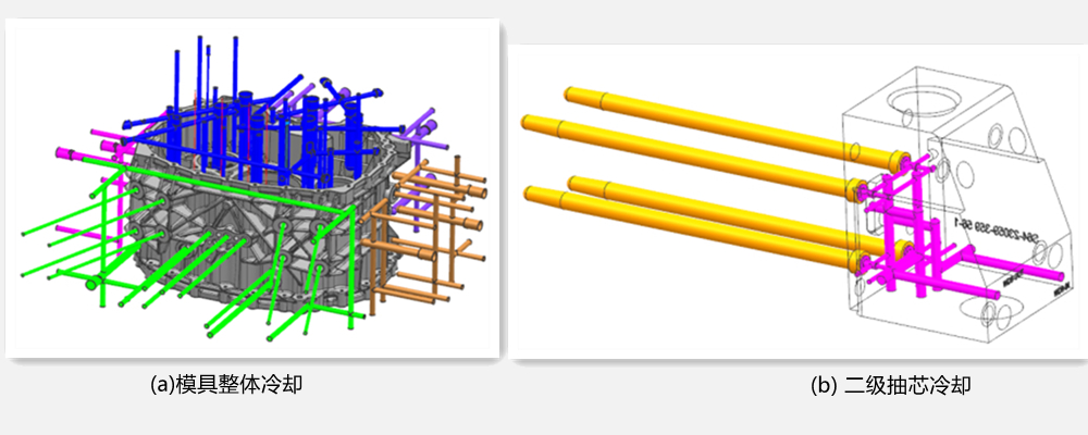圖5:二級抽芯動作過程 3.3 模具冷卻系統設計 模具冷卻系統對鑄件質量、模具壽命以及生產穩定性起著關鍵性因素。為保證此鑄件內部品質,在模具四周及上下位置分別設計各種類型水路,見圖6。從圖6a可以看出,在動定模上設計大的循環冷卻,深腔部位均設計點冷卻或高壓冷卻,盡可能消除局部過熱而產生縮孔、裂紋及粘模問題;由于底部滑塊嵌套式的抽芯機構設計,導致大循環冷卻水布置時空間位置小,僅在周邊設計1組循環冷卻,其余在過熱位置設計多個點冷卻;其余兩側面,由于深腔位置及孔系少,結構簡單,主要以多層循環冷卻為主,以確保模具溫度的穩定和平衡。從圖6b可以看出,在2個二級抽芯上分別設計1組復雜的循環冷卻,不僅能夠冷卻每個型銷,而且能夠冷卻斜抽芯機構,使得抽芯機構的工作狀態平穩,故障率低,生產效率高。