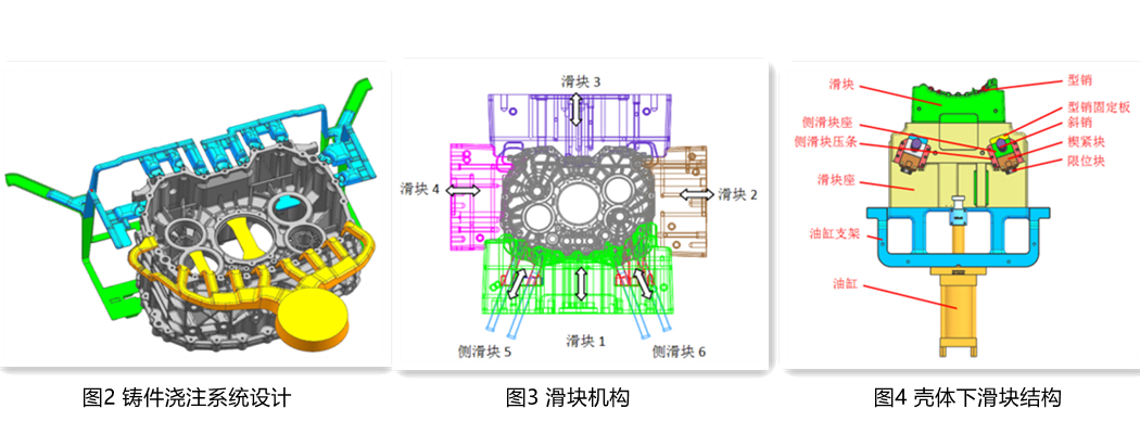 圖1:變速器殼體產品三維模型 2、澆注系統的設計 產品結構及澆注系統對模具結構起決定性作用,合理的澆注系統,不僅能夠保證鑄件質量,還可簡化模具。為解決難點1,保證兩側大軸承孔內部質量,對產品(圖2)進行小改進,在軸承孔表面增加些許密集小網格,以緩解鑄件表面缺陷,特別是氣孔和增加表面積,從而增加散熱面,提高散熱效率。 在靠近兩側大軸承孔端面(機加工面)設計澆排系統(見圖2),專門設計1條支路填充遠處大軸承孔,確保軸承孔內部質量;在鑄件遠處或匯集部位設置集渣包,保證遠端冷料及氣體、夾渣能夠最大限度的流入,以消除鑄件缺陷。另外,此澆注系統可使用機械電鋸或后續采用切邊模去除,其余殘留澆冒口通過機加工就可去除,鑄件外觀質量好。 采用此種澆注系統后,模具分型面只能選擇靠近兩側大軸承孔端面上,正面淺腔設計在定模上,背面深腔設計在動模上,4個側面設計為上下左右共4(?)個滑塊,圖1b所示的復雜側面位于模具底部。 3、模具設計 3.1 滑塊結構設計 根據鑄件結構特點,除動定模之外,在鑄件四周加強筋部位進行分模(圖3),由于8個螺紋孔(模具設計為型銷)與底部出模方向角度不一致,設計兩個側滑塊5、6,采用多滑塊嵌套式的抽芯機構(又叫二級聯動抽芯機構)進行抽出。采用各自的傳動元件,在模具開模時,先抽出側滑塊5、6,再抽出滑塊1,完成開模動作,模具合模時,大滑塊1復位后,小滑塊再復位。