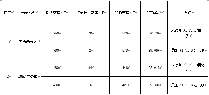 表5:Al-Ti-B細化劑添加前后產品合格率對比 3.2 添加Al-Ti-B細化劑對產品內部縮松、縮孔鑄造缺陷的對比