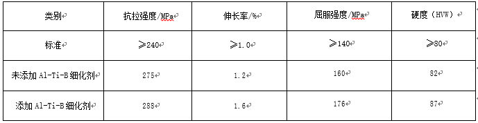 表2:AlSi9Cu3合金的力學性能 1.1.2 試驗用Al-Ti-B細化劑化學成分 選擇試驗用Al-Ti-B細化劑為Al-5Ti-1B,其成分見表3,在A化學成分穩定一致情況下進行試驗。