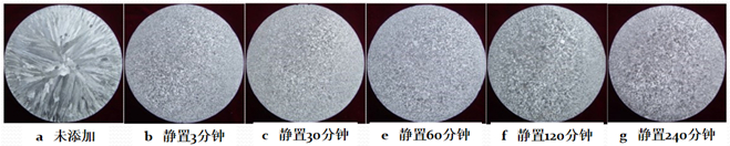 圖1:Al-Ti-B細化劑加入前后鋁合金的金相組織 2.2 保溫時間對變質后鋁合金晶粒尺寸的影響