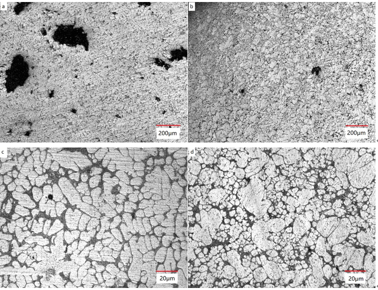 圖11:不同工藝疲勞試樣近斷口金相圖:(a)液態壓鑄400×;(b)半固態壓鑄400×;(c)液態壓鑄1000×;(d) 半固態壓鑄1000× 圖11為不同工藝試樣近斷口截面金相圖。通過圖11a和圖11b的對比,可以看出液態壓鑄試樣的金相圖存在大量孔洞,而且存在直徑大于200 μm的孔洞,這與圖9a液態壓鑄試樣的斷口形貌相對應。圖9a中液態壓鑄試樣近斷口截面彌散分布的細小孔洞的平均等效直徑范圍為73.6~138.3μm。有研究指出,未處于疲勞源區的孔洞,對于鑄件疲勞性能的影響存在臨界尺寸,平均等效直徑大于60 μm的孔洞在裂紋擴展區形成的應力集中會加速裂紋的擴展,降低試樣的疲勞性能,而且孔洞的形狀越不規則損害越大。 從圖11c和圖11d來看,高倍下液態壓鑄試樣的組織主要為粗大的枝晶組織。半固態壓鑄試樣的組織除去少量粗大的初生α(Al)晶粒,更多的是細小而圓整的顆粒狀晶粒。晶界會對疲勞裂紋的第一階段的擴展造成阻礙,位錯滑移距離為晶粒尺寸,細小的晶粒會加大位錯運動間距,減小交互作用力,這樣宏觀應力較小,加強了疲勞性能。這也可以解釋圖7和圖8中一些試樣雖然缺陷區域尺寸相近,但半固態壓鑄件表現了更好的疲勞性能。 3、結論 (1)與液態壓鑄相比,半固態壓鑄的ZL114A鋁合金試樣疲勞性能總體更高并且更加穩定。半固態壓鑄ZL114A鋁合金試樣在密度大于2.62 g/cm³時,疲勞性能表現良好。在70 MPa應力下,疲勞壽命可達107次。 (2)半固態壓鑄件的疲勞壽命與密度成正比。試樣密度越高,試樣的疲勞壽命越高。液態壓鑄試樣的疲勞壽命主要受孔洞尺寸影響,孔洞尺寸越大,疲勞壽命越低。 (3)液態壓鑄試樣整個截面均有孔洞,裂紋萌生于大的氣縮孔,半固態壓鑄試樣的孔洞集中在中心附近,裂紋萌生源傾向于中心縮松多孔的綜合作用。