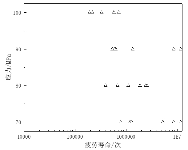 圖3:半固態壓鑄試樣疲勞試驗結果 液態和半固態壓鑄試樣的疲勞試驗結果如圖2和圖3。可以看出兩組數據在每個應力級上均有較大的離散度。但對比可以明顯看出總體上半固態壓鑄試樣的離散程度明顯小于液態壓鑄試樣。液態壓鑄試樣的疲勞壽命在80 MPa和90 MPa應力級上呈現了極大的離散度。在100 MPa應力級上,可以明顯看出液態壓鑄試樣的疲勞壽命在100 000次附近明顯低于半固態壓鑄試樣的400 000次。在其他應力級對比不明顯的情況下,這能夠在一定程度上反映出半固態壓鑄試樣的疲勞強度優于液態壓鑄試樣。