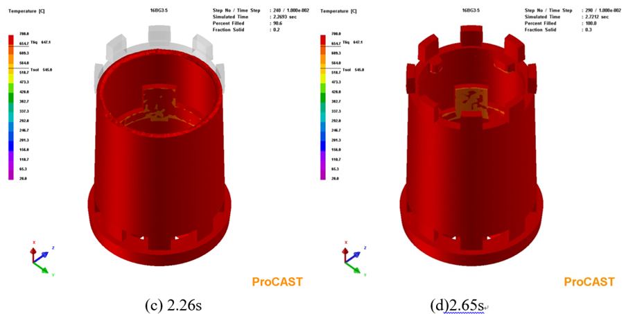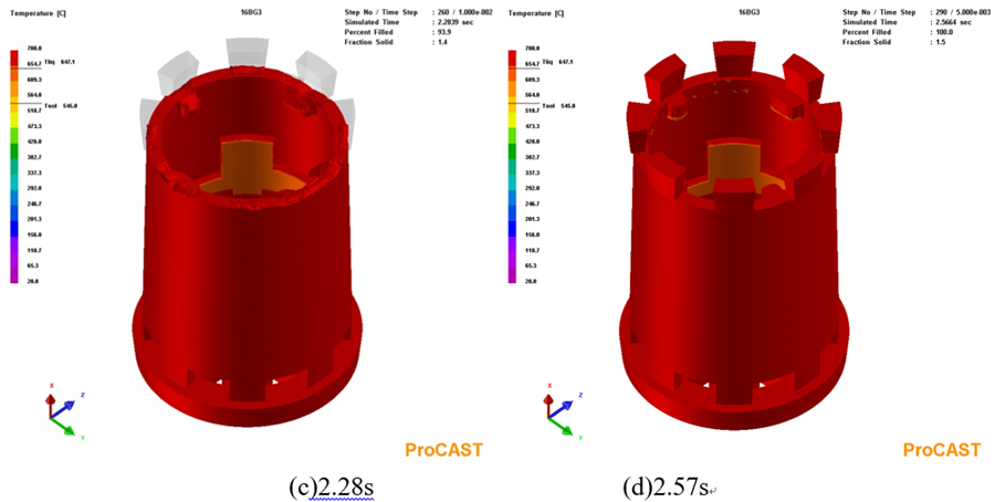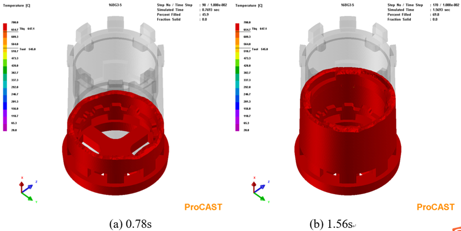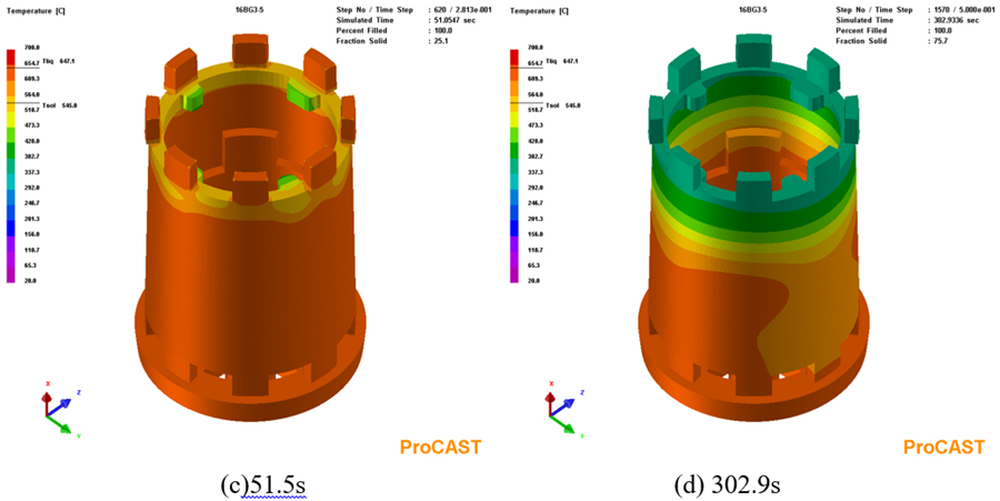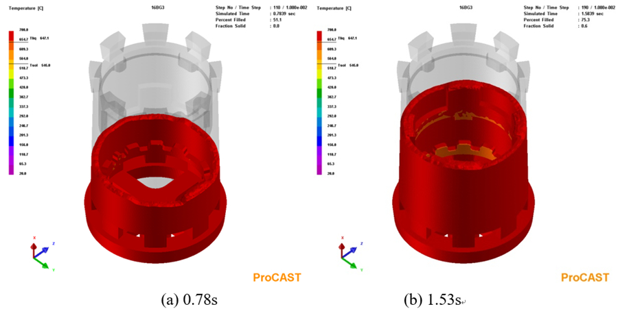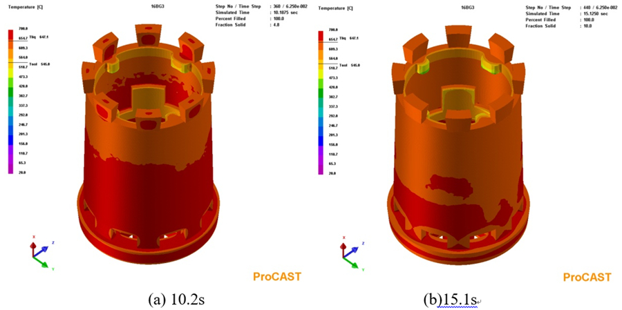 圖6:鑄件充型過程溫度場 圖7為合金液充型結束后凝固過程中鑄件于不同時間的溫度分布。可以看出,合金液充型結束后,鑄件降溫最快區域為鑄件頂部的上端框處,因為該區域合金液最先進入型腔的,再加上上端框處放置著冷鐵,合金液冷卻速度較快,溫度最低;冒口相對上端框部位的凝固溫度更高,凝固時間更長,冒口對上端框區域具有一定的補縮作用。整個鑄件自上而下溫度逐漸升高,符合自上而下逐層順序凝固的設想。隨著時間延長,鑄件整體的溫度逐漸下降,但整個降溫過程中鑄件一直保持著自下而上溫度逐漸升高的正溫度梯度,這能最大限度地發揮冒口的補縮作用,降低鑄件內部縮松類缺陷的傾向,對整個鑄件的質量改善是有利的。但在鑄件的局部區域存在一些熱節,這些位置相對于周圍在同一時間溫度更高,凝固時間更長,在后期凝固過程中得不到周圍合金液的補縮,容易出現縮松等收縮類缺陷。