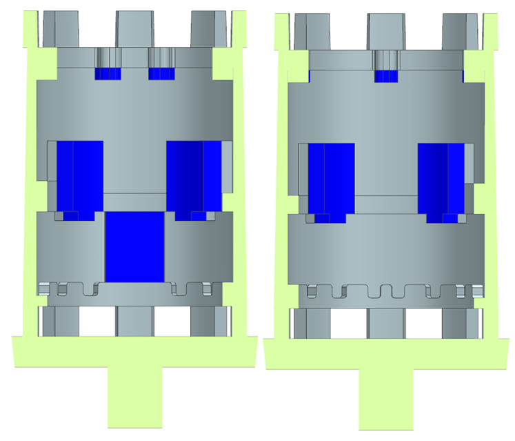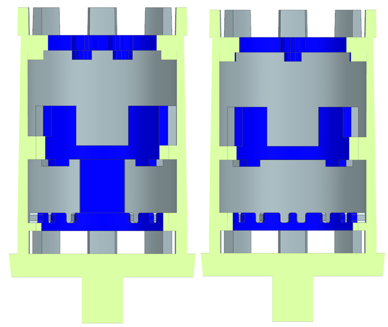 圖9:改進后的冷鐵結構及分布示意圖 在改進工藝的基礎上,通過ProCAST對筒形件鑄件的澆注充型過程、凝固過程以及缺陷預測進行模擬仿真,充型過程見圖10。可以看出,合金液通過內澆道進入鑄件型腔后,首先進入鑄件的下端框厚壁區域,隨后流經艙體中部區域,之后流到上端框厚壁區域,最終從鑄件底部由下而上逐步充滿鑄型型腔,鑄件整體呈現自下而上依次充型。整個過程中,合金液充型比較平穩,直至全部充滿型腔。在充型過程中,合金液平穩,不容易發生卷氣現象,氣孔和氧化夾渣等鑄造缺陷產生的傾向小。