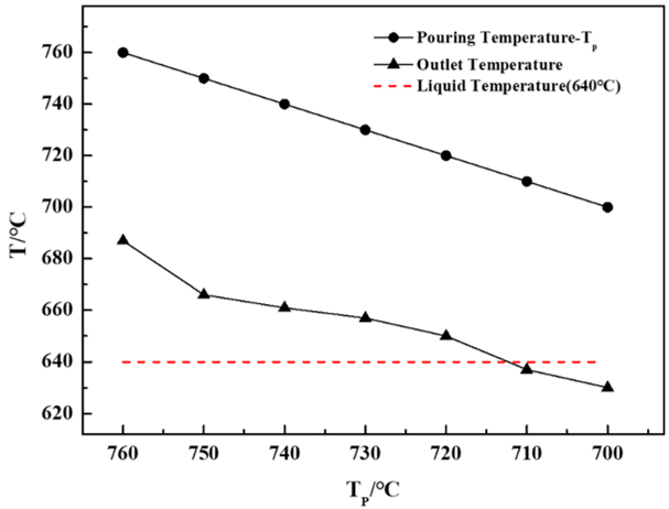 圖2:Al-5Zn-2Mg-1Cu-0.2Sc合金漿料的澆注溫度和出口溫度關(guān)系圖