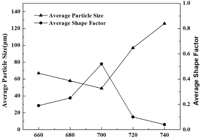 圖3:澆注溫度為690℃時,漿料在滾筒筒壁上形成的凝固殼 2.2 澆注溫度對漿料組織的影響 圖4和圖5分別為不同澆注溫度下漿料的金相組織和XRD圖譜。可以看出,合金主要由初生α-Al、 MgZn2、AlCuMg、Al2Cu和Al3Sc等第二相組成。隨著澆注溫度的降低,漿料中的初生α-Al枝晶逐漸減少,近等軸狀初生相逐漸增加,晶粒尺寸減小,平均圓整度增加,見圖6。 當澆注溫度為740 ℃時,初生α-Al晶粒平均尺寸為67.4 μm,平均圓整度為0.16,晶粒主要呈現(xiàn)出兩種不同的形態(tài):尺寸較大的薔薇狀和樹枝晶和尺寸較小的近等軸晶,其圓整度較低,見圖4a。當澆注溫度降低到720 ℃時,開始出現(xiàn)尺寸較小的近球形晶粒。隨著溫度進一步降低到700 ℃,薔薇狀晶粒基本消失,且α-Al平均晶粒尺寸降低到35.1 μm,圓整度提升至0.49,此時半固態(tài)漿料質(zhì)量最佳。
