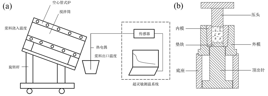 圖1:機械旋轉(zhuǎn)滾筒與流變擠壓鑄造示意圖 對Al-5Zn-2Mg-1Cu-0.2Sc合金進行組織與性能分析。采用全譜直讀型電感耦合等離子體發(fā)射光譜儀(ICP-AES)分析化學成分,結(jié)果見表1。試樣經(jīng)打磨拋光至鏡面后使用keller試劑(5 mLHNO3+3 mL HCl+2 mL HF+190 mL H2O)進行腐蝕。采用光學顯微鏡(ZEISS Axio observer A1)和掃描電鏡(Phenom XL)進行組織觀察,采用JEM2100透射電鏡觀察合金的高倍顯微組織并鑒定合金中相的結(jié)構(gòu)。采用Rigaku D/max-2550V型衍射儀進行X射線分析,掃描角度范圍為10°~90°,掃描速度為10°/min。室溫拉伸試驗在Zwick/Roell Z100電子力學性能萬能試驗機上進行測試,拉伸速率為1 mm/min。