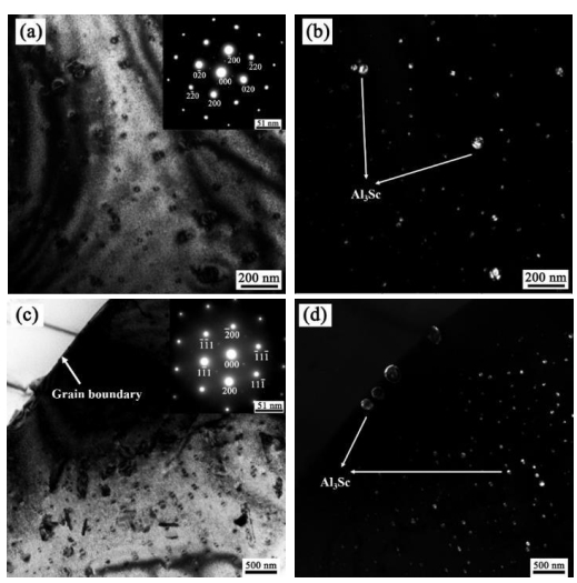 圖12:合金Al-5Zn-2Mg-1Cu-0.2Sc時效120℃×24h的金相與SEM組織 從圖13a和圖13b中的明場像和暗場像都可以發(fā)現(xiàn),在晶粒內(nèi)部除GP區(qū)和少量η′(MgZn2)相外,均勻分布許多細小的顆粒。通過在[001]軸獲取的該區(qū)域的超點陣衍射斑點,經(jīng)過軟件計算出其晶格常數(shù)a=0.4172 nm,面心立方結(jié)構(gòu)(FCC),Al3Sc的晶格常數(shù)為0.410 nm,鋁基體的晶格常數(shù)為0.405 nm,可確定這些顆粒為Al3Sc相。對圖10a中的顆粒進行尺寸統(tǒng)計,Al3Sc相的平均晶粒尺寸約為22 nm。從圖13c和圖13d的明場像和暗場像中可以發(fā)現(xiàn),在晶界處有一些尺寸較大的第二相,通過分析在[011]軸獲取的該區(qū)域的超點陣衍射斑點,確定這些第二相為Al3Sc。根據(jù)第二相粒子強化機制,這些細小彌散的Al3Sc粒子均勻分布在基體中,通過對位錯運動的阻礙作用可以起到顯著的強化效果,這是含Sc合金強度提高的主要原因之一。