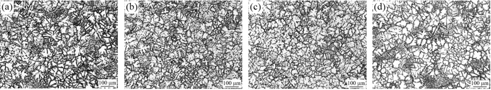 圖4:不同澆注溫度下Al-5Zn-2Mg-1Cu-0.2Sc合金漿料的金相組織(a)740℃ (b)720℃ (c)710℃ (d)700℃