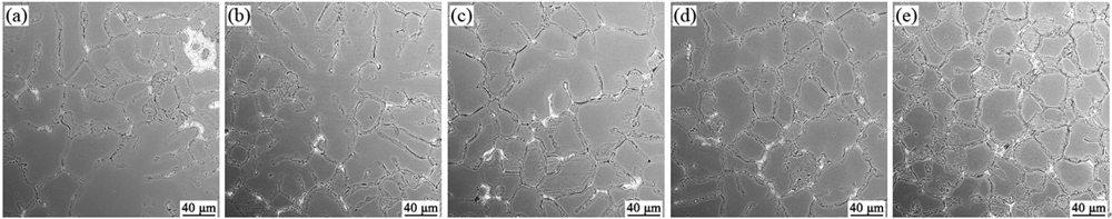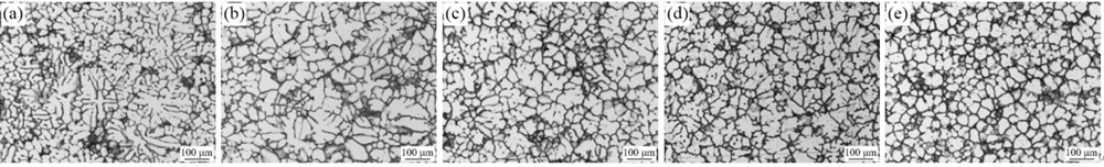 圖7:不同澆注溫度下流變擠壓鑄造合金的金相組織(a)760℃ (b)740℃ (c)720℃ (d)710℃ (e)700℃
