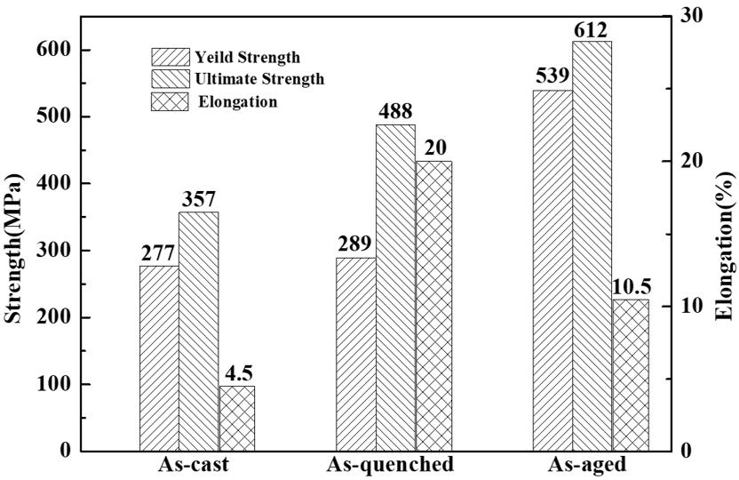 圖13:120 ℃×24 h時效后合金的TEM明場和暗場分析 2.4.3 力學性能 對熱處理合金進行力學性能測試,并與鑄態(tài)合金相對比,結(jié)果見圖14。對合金進行時效處理后屈服強度、抗拉強度和伸長率可達539 MPa、612 MPa和10.5%,與變形合金7075-T651性能相當。