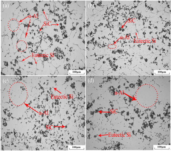 (a)坯料;(b)擠壓;(c)固溶;(d)固溶+時效圖2 SiCp/ZL101復合材料顯微組織