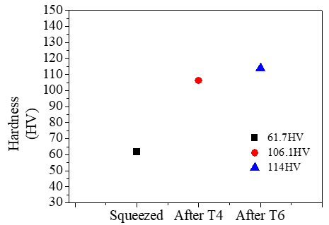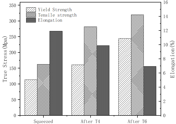 圖6:SiCp/ZL101鋁復合材料在不同熱處理條件下的顯微硬度 3、結論 (1)使用半固態機械攪拌和近液相線技術成功制備的SiCp/ZL101鋁復合材料,顯微組織為近球形的α-Al和共晶Si組織,SiC能較為均勻地分散在基體中;二次加熱后擠壓獲得SiCp/ZL101復合材料。 (2)經過固溶處理的SiCp/ZL101復合材料顯微組織中共晶Si的形態發生了明顯的轉變,由長條狀轉變為球狀,進行時效處理后,基體和增強相界面的析出相數量增加。 (3)固溶+時效處理后的SiCp/ZL101復合材料抗拉強度、屈服強度和伸長率達到了320MPa、244MPa和6.91%,硬度(HV)達到114;斷裂機理由微孔聚集型斷裂轉變為準解理斷裂,時效過程析出的第二相和產生的原子聚集區可能是導致材料塑性大幅下降的原因。