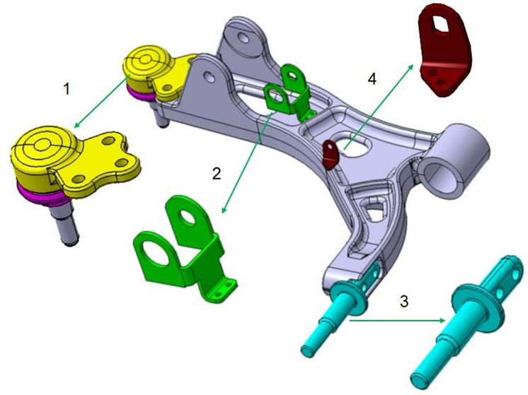 圖2:鋁合金控制臂的概念設計方案 圖 2中1處,將控制臂改為鋁合金鑄件后,球頭組件與控制臂的連接方式將由原有的焊接方式改為螺栓連接。為滿足更改后的連接方式,球頭鍛件的結構必須重新進行設計,并通過機械加工完成樣件制作。只允許更改連接部分與球頭相關的部件包括軸,防塵、球碗、卡環、球頭銷,夾子和球套結構則不允許更改。 為保證鑄件的結構完整性,鑄造工藝性能以及鑄件的整體性能,確認將原有沖焊的減震器支座分為兩體設計。減震器主支座改為鋁合金設計,并與控制臂主體完成集成設計。減震器副支座仍然為沖焊結構,在通過對原有部件切割的基礎上增加底座,通過焊接的方式形成組件,組件通過螺栓連接的方式與鋁合金控制臂連接,組件的結構示意見圖 2中2處。在鋁合金控制臂上要設計副支座的安裝限位,保證安裝到位。 圖 2中3處在原有設計中所有部件均為鋼制部件,更改為鋁合金后,軸部位材料為鋁合金,與之配合的是鋼制部件,在通常情況下鋁合金部件不能夠與其發生直接的摩擦配合。考慮有兩種解決方案,其一通常是采用增加鋼制墊片的方式解決鋁制部件與鋼制部件的配合問題,在增加鋼制墊片后,原有設計中軸的尺寸將發生改變,需要重新設計;其二是借用原有的鋼制部件,重新設計連接部分結構,通過螺栓連接實現部件的裝配。 2.2 產品的設計方案 圖 3鋁合金控制臂的設計方案。基于原有沖焊部件設計,無法對原有周邊的裝配環境進行更改,必須仔細考慮原有部件的結構與裝配。總體設計方案是采用集成設計“H”型的鋁合金擠壓控制臂取代原有的上板,下板,連接上板,連接下板,襯套套管和減震器支架形成一個整體控制臂。
