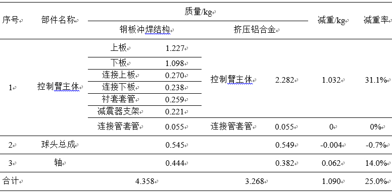 圖4:6種工況條件下的CAE應力分析結果 2.4 產品設計總結 表 1為原有結構與全新設計結構部件質量對比。通過采用集成控制臂鑄件取代了原有的上板,下板及連接上板等6個部件,并借用原有的連接套管。由表 1中的被替代的鋼制部件和集成鋁合金控制臂質量數據可見,采用鋁合金集成鑄件后,質量下降31%。球頭總成和軸借用了原有結構,但重新設計了連接部分的結構,并采用了螺栓連接方案。 原有設計結構的總質量為4.358 kg,全新設計結構質量為3.268 kg。可見通過應用鋁合金金集成鑄件并借用部分原有結構設計形成的鋼鋁混合結構可以實現部件總成減重25%的效果,實現了預定的減重目標。