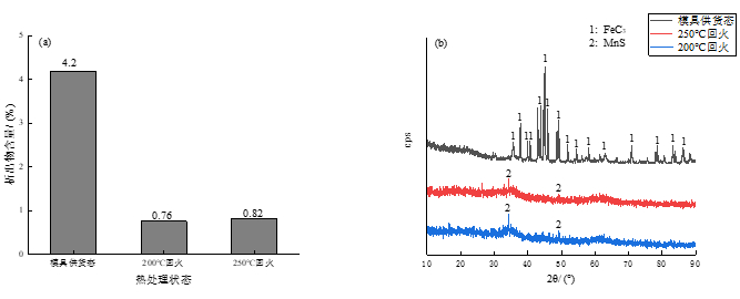 圖9:不同狀態(tài)下實驗鋼析出物含量和XRD分析 由此可見,模具供貨態(tài)實驗鋼的析出物為滲碳體,這和在掃描電鏡下觀察到的析出物即滲碳體顆粒,而模具供貨態(tài)實驗鋼組織正是由片狀珠光體組織和網(wǎng)狀鐵素體組成,其中珠光體正是由α相和滲碳體組成的機械混合物,故其XRD分析結(jié)果中析出物為滲碳體,而滲碳體的存在會在一定程度上提高材料的耐磨性,但由于其基體組織為網(wǎng)狀鐵素體和片狀珠光體組織,故耐磨性仍較低。 經(jīng)過200 ℃和250 ℃回火后,XRD分析顯示無較明顯的衍射峰,由圖9b可以看出有極少量MnS析出,屬于鋼中最常見的非金屬塑性夾雜物之一,除此之外,并未觀察到碳化物析出,但是考慮到其基體組織為回火馬氏體和少量殘留奧氏體,與模具供貨態(tài)相比有本質(zhì)上的區(qū)別,正是由于基體組織的明顯改善反映出淬火回火后實驗鋼耐磨性得到顯著提高。 3、結(jié)論 (1) 經(jīng)過淬火回火后實驗鋼由模具供貨態(tài)的片狀珠光體和網(wǎng)狀鐵素體組織轉(zhuǎn)變?yōu)榛鼗瘃R氏體和少量殘留奧氏體組織,力學性能大幅度改善。經(jīng)過淬火+200 ℃回火后實驗鋼抗拉強度和硬度分別達到最大值1287.8 MPa和480.1HBW。且隨著回火溫度達到250℃,抗拉強度和硬度降低。 (2) 模具供貨態(tài)實驗鋼含有最高含量析出物FeC3,而經(jīng)淬火回火后實驗鋼析出物含量極少,僅發(fā)現(xiàn)有少量MnS非金屬夾雜物存在。 (3) 模具供貨態(tài)實驗鋼磨損率和摩擦因數(shù)最高,淬火+200 ℃回火后磨損率和摩擦因數(shù)最低分別為0.27%和0.38,250 ℃回火次之。綜合考慮不同狀態(tài)下實驗鋼耐磨性的測試結(jié)果,確定經(jīng)過淬火+200 ℃回火后的實驗鋼耐磨性最佳,250 ℃回火次之,均優(yōu)于模具供貨態(tài)的耐磨性。