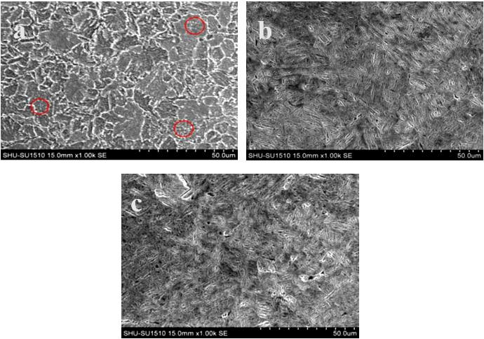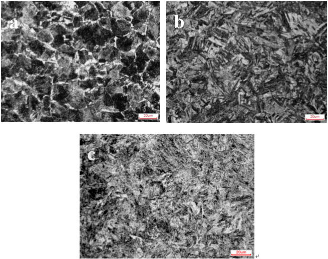圖2:拉伸樣尺寸示意圖 2、試驗結(jié)果與分析 2.1 顯微組織 圖3為不同狀態(tài)下實驗鋼顯微組織,從圖3a可以看出,模具供貨態(tài)下的實驗鋼室溫組織為白色呈網(wǎng)狀分布的鐵素體和片狀珠光體組成,網(wǎng)狀鐵素體沿晶界分布在片狀珠光體之間,對組織之間的連續(xù)性造成破壞,從而使基體結(jié)構(gòu)受到損壞,材料本身的硬度,抗拉強度和耐磨性等性能均會受到明顯不利影響,在材料受到外力擠壓出現(xiàn)微小裂紋時,其裂紋會沿著呈網(wǎng)狀形態(tài)的鐵素體迅速進行延伸和擴展,使得工件更易損傷和斷裂。有研究指出,在冷卻過程中多余的鐵元素在過冷奧氏體中會由晶粒內(nèi)部向晶粒外部進行析出,以達到維持其自身的相平衡和穩(wěn)定性的目的,從而形成了先共析鐵素體相,由于這種向晶粒外部四周析出的過程并無方向性,則這些鐵元素會逐漸富集到將其析出的晶粒的晶界上,從而會沿著四周把整個奧氏體晶粒“包”起來,故從微觀上呈現(xiàn)出網(wǎng)狀鐵素體的組織形態(tài)。此外,除了觀察到網(wǎng)狀鐵素體組織之外,還發(fā)現(xiàn)了魏氏組織的存在。魏氏組織的形成主要是由于亞共析鋼或者過共析鋼在較高的溫度進行冷卻時,在奧氏體晶界上產(chǎn)生先共析鐵素體并且沿著一定的晶面朝著晶內(nèi)進行快速生長,且呈針狀分布在基體組織中,這種組織屬于加工處理時產(chǎn)生的缺陷之一,而魏氏組織的出現(xiàn)則會使得材料強度硬度變低,塑韌性降低,影響材料的使用壽命。