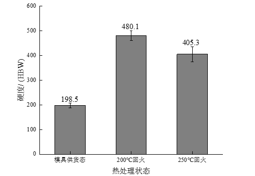 圖4:不同狀態(tài)下實驗鋼SEM圖 2.2 拉伸力學性能 不同狀態(tài)實驗鋼的宏觀硬度測試后結(jié)果見圖5,在經(jīng)過淬火+200 ℃回火后的實驗鋼硬度最高達到480.1 HBW,當回火溫度升高到250 ℃,硬度降至405.3 HBW,其原因主要是因為低溫回火的過程實際上就是過飽和馬氏體逐漸分解的過程,隨著回火溫度升高,碳原子活動能力增強,固溶在馬氏體中的碳原子會逐漸進行較長擴散并形成細小且彌散的碳化物析出,使得馬氏體中的碳含量降低,基體發(fā)生軟化,在宏觀上表現(xiàn)出硬度下降。此外,模具供貨態(tài)實驗鋼的硬度顯著低于經(jīng)過淬回火后的實驗鋼的硬度,這與各自對應(yīng)的顯微組織之間的關(guān)系密不可分,模具供貨態(tài)實驗鋼由片狀珠光體和網(wǎng)狀鐵素體組織組成,而鐵素體屬于軟相,而珠光體又是由鐵素體和滲碳體共同組成,滲碳體的存在會在一定程度上起到增加珠光體組織的硬度的作用,但由于該實驗鋼中碳的含量為0.48%,根據(jù)杠桿定律估算,其珠光體中滲碳體所占比例大約為7%,故其鐵素體和珠光體組織兩者硬度差異并不大,都具有較低硬度。而200 ℃和250 ℃回火得到實驗鋼基體組織為回火馬氏體組織,其組織硬度遠高于珠光體和鐵素體組織,從而使得經(jīng)淬回火后的實驗鋼硬度得到顯著提高,由此為良好耐磨性奠定了基礎(chǔ)。