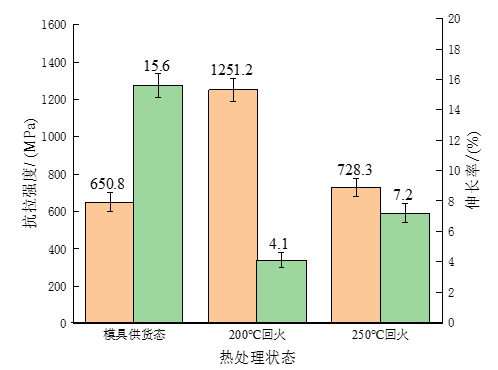 圖5:不同狀態(tài)下實驗鋼硬度曲線圖 對不同狀態(tài)下實驗鋼試樣進行拉伸實驗,測得其抗拉強度和伸長率變化見圖6。與模具供貨態(tài)相比,經(jīng)過淬火+低溫回火后實驗鋼的抗拉強度得到明顯提高,從650 MPa分別提升至1287.8 MPa和728.3 MPa。模具供貨態(tài)實驗鋼由于其網(wǎng)狀鐵素體和魏氏組織的存在,會致使基體內(nèi)部組織的連續(xù)性受到破壞,其次還會嚴重割裂珠光體組織之間的聯(lián)系,使得其抗拉強度大幅度降低,而且還會在受到外力時極易發(fā)生變形與斷裂。與經(jīng)過200 ℃回火相比較而言,可以發(fā)現(xiàn)250 ℃回火后實驗鋼的伸長率增加而抗拉強度降低,主要是由于實驗鋼在經(jīng)過250 ℃回火后馬氏體得到進一步的分解,碳原子的存在形式發(fā)生了變化,由固溶于過飽和馬氏體逐漸轉(zhuǎn)變?yōu)樘蓟铮⑦M行析出,造成的晶格畸變效應(yīng)減弱。由于回火溫度低,析出的碳化物過于細小,使得析出物的彌散強化作用的效果小于過飽和度降低引起的固溶強化作用減弱的效果,且隨著回火溫度的升高,淬火時產(chǎn)生的內(nèi)應(yīng)力得到一定程度上的釋放,位錯密度逐漸降低,從而表現(xiàn)出抗拉強度升高而伸長率下降的現(xiàn)象。綜上所述,本實驗在模具供貨態(tài)的基礎(chǔ)上對其進行了熱處理工藝改進,在進行了淬火和低溫回火后,實驗鋼的強度和硬度均得到了明顯的提升,而經(jīng)過200 ℃回火后其硬度和抗拉強度最高,經(jīng)過250 ℃回火后伸長率最優(yōu),但研究主要目的在于提高其在工作環(huán)境下的耐磨性能,故需要進一步對不同狀態(tài)下實驗鋼耐磨性進行對比研究。