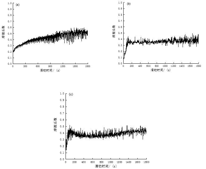 圖7:干摩擦條件下不同狀態(tài)下實驗鋼的磨損率 圖8為3種狀態(tài)下實驗鋼對應(yīng)的摩擦因數(shù),可以明顯看出其磨損過程均呈現(xiàn)出兩個階段。首先實驗鋼與其對磨材料兩者接觸表面較高的微凸體之間會首先進行點接觸或線接觸,并很快會在之后的磨損過程中受到碰撞而變形、斷裂或磨平,進而有少量的磨屑隨之產(chǎn)生,而磨屑會分布在接觸表面增大摩擦表面粗糙度,造成摩擦因數(shù)逐漸升高,這一階段即為跑和時期。隨著摩擦時間增加, 在外壓力的作用下材料摩擦表面剩余的微凸體之間繼續(xù)接觸從而發(fā)生嚴重的變形和斷裂,導(dǎo)致材料表面間的接觸由最開始的點接觸和線接觸慢慢轉(zhuǎn)變?yōu)閮蓚€面之間的接觸,在相對運動時實際接觸面積增大,產(chǎn)生更大的磨損,產(chǎn)生磨屑也不斷增多。 當磨屑數(shù)量增加到一定程度,因受外壓力后逐漸形成一層具有減弱材料磨損作用的磨屑膜,且摩擦因數(shù)不再隨著磨損過程的進行而增大,即為穩(wěn)定摩擦階段。 此外,隨著摩擦持續(xù)進行,磨屑膜不斷遭到破壞后繼而形成新的磨屑,新的磨屑在外力的擠壓作用下逐漸形成新的磨屑膜,當磨屑膜的形成和消失達到一個動態(tài)的平衡時, 摩擦因數(shù)就會出現(xiàn)間斷性波動。 對比3種實驗鋼的磨損過程和摩擦因數(shù),會發(fā)現(xiàn)模具供貨態(tài)實驗鋼在1 800 s的磨損過程中,其摩擦因數(shù)呈逐步增加的趨勢,且由圖8明顯看出在3種狀態(tài)中其摩擦因數(shù)最高,平均達到了0.51,說明其耐磨性最差,這也與在模具供貨態(tài)下磨損率最高相一致。另外,結(jié)合其顯微組織為網(wǎng)狀鐵素體和片狀珠光體兩相組織,宏觀硬度較低,耐磨性也相對較差。而實驗鋼在經(jīng)過淬火+200 ℃,250 ℃回火后,其平均摩擦系數(shù)明顯降低,分別為0.38和0.40,與模具供貨態(tài)相比,其耐磨性得到了大幅度的改善,這與形成回火馬氏體組織之間的關(guān)系是密不可分的。