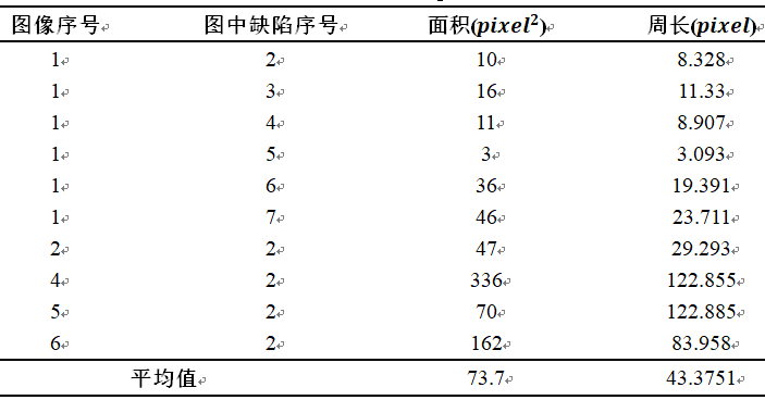 表2:夾渣缺陷的面積和周長 針對鋁合金壓鑄件典型缺陷的特征進行提取,通過使用高斯濾波處理、線性增強、Otsu閾值分割法及局部閾值法對圖像進行處理,得到經(jīng)過處理的二值圖像,最后對二值圖像直接進行特征提取。整個過程基于MATLAB實現(xiàn)了對缺陷的面積和周長特征的自動化快速提取,解決了鋁合金壓鑄件X射線圖像典型缺陷的特征提取維度缺乏、人工干預(yù)影響特征提取效率的問題。由于鋁合金壓鑄件X射線圖主要呈現(xiàn)二維圖像,本次試驗的鋁合金壓鑄件缺陷特征提取主要集中于二維數(shù)據(jù)的提取,希望以后能出現(xiàn)很好的三維鋁合金壓鑄件X射線圖并且便于進行缺陷特征的提取。