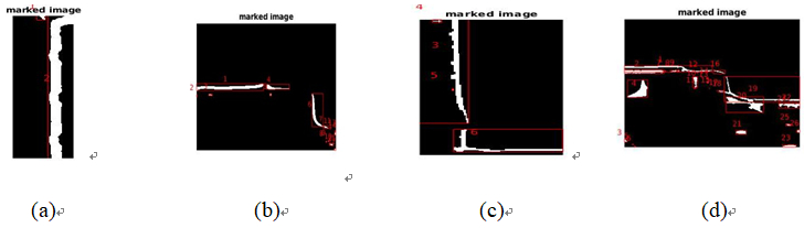 表1:缺陷面積以及周長 圖8a中有一連串的氣孔,普遍面積較小,并且有一部分氣孔被白色光源污染導(dǎo)致無法被提取。其他氣孔的面積和周長都被很好的提取出來了,如果在拍攝圖像的時候?qū)ο袼攸c的長度進行標度,也就能直接得到氣孔缺陷的面積和周長了,對后續(xù)的工藝分析能夠提供幫助。 然后展示對夾渣缺陷面積和周長的特征提取,同樣首先先對圖像中的缺陷部位進行捕獲,見圖9。
