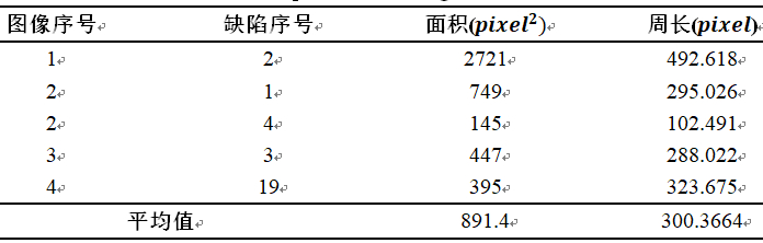 圖9:夾渣缺陷的特征提取效果 從圖9可以看出,提取效果整體較好,但會出現(xiàn)一些過度提取的情況,這個時候需要人工來幫助判斷具體哪一個部分才是真正的夾渣缺陷。表2為提取到的缺陷的周長和面積。