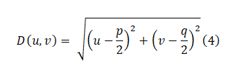式中,Do為截止頻率;D(u,v)為各點與頻率矩形中心的距離。其中D(u,v)的計算公式如下: