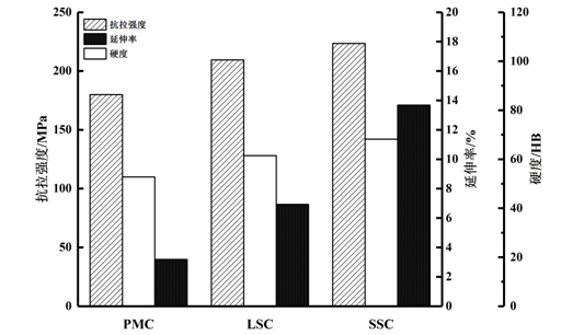 表2:不同鑄造方式制備A356合金中共晶Si相形貌和合金導熱性能 2.3 對力學性能的影響 圖8為不同鑄造方式試樣的硬度、抗拉強度及伸長率,PMC試樣的抗拉強度為179.930 MPa,伸長率為3.19%硬度(HB)為55,LSC試樣的抗拉強度為209.446 MPa,伸長率為6.93%,硬度(HB)升高到64;而SSC的試樣抗拉強度提高至223.514 MPa,伸長率為13.68%,硬度(HB)提高至71。
