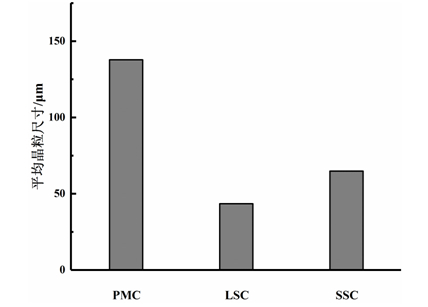圖2:不同鑄造方式制備A356鋁合金試樣的顯微組織 用Image-pro Plus 6.0軟件對基體晶粒尺寸統計分析結果見圖3。PMC過程凝固過冷度小,α-Al晶粒為粗大的樹枝晶,平均晶粒尺寸為137.807 μm。擠壓鑄造過程大大改善鑄型與鑄件間的熱交換條件,且在擠壓作用下,合金熔點相較于傳統鑄造時的升高,增大了合金熔體凝固時的初始過冷度。LSC過程中合金的凝固潛熱較快釋放,阻礙合金熔體中原子的擴散,抑制初生α-Al相的長大,使晶粒尺寸細小,平均晶粒尺寸驟降至43.512 μm。過冷度作為凝固的驅動力,其增加使臨界形核半徑減小,形核率上升,使晶粒數量增多。半固態制漿時,熔體在滾筒的攪拌作用下產生對流,使晶粒之間產生碰撞,抑制粗大樹枝晶的生成,將枝晶臂打斷,形成許多細小的晶粒。隨著溫度的降低,這些細小的晶粒無明顯取向的均勻長大,α-Al相整體形貌比較圓整,平均晶粒尺寸為64.824 μm。