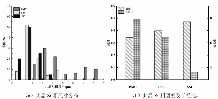 圖5:不同鑄造方式制備A356鋁合金共晶Si的尺寸分布及形狀變化