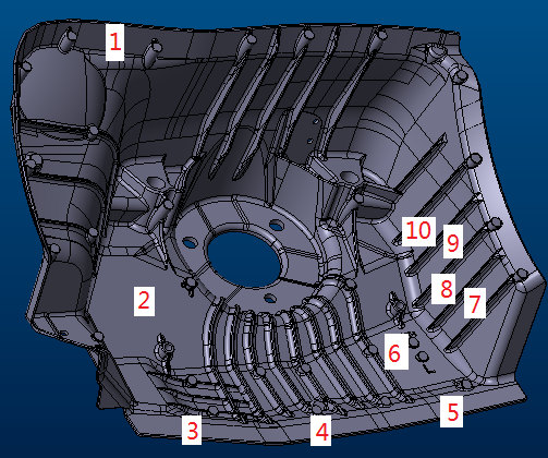 圖2:澆注系統設計示意圖 2.試驗方法與措施 試驗所用的是正常生產的高真空壓鑄件。鑄件放入高溫電阻爐中進行T6熱處理,然后按不同的熱處理工藝進行編組,按組分別取樣分析。 試樣都是從模具右邊型腔截取,取樣位置和樣品編號見圖3,隨后用數控機床按圖4的形狀加工成標準拉伸試樣。在拉伸試驗機上進行力學性能測試。