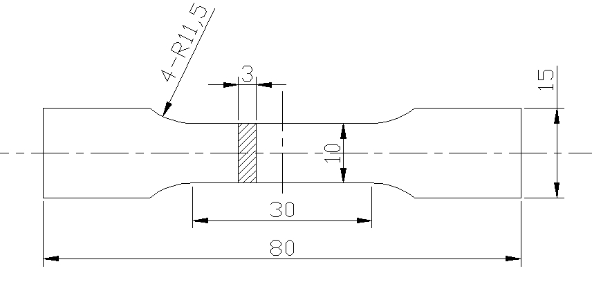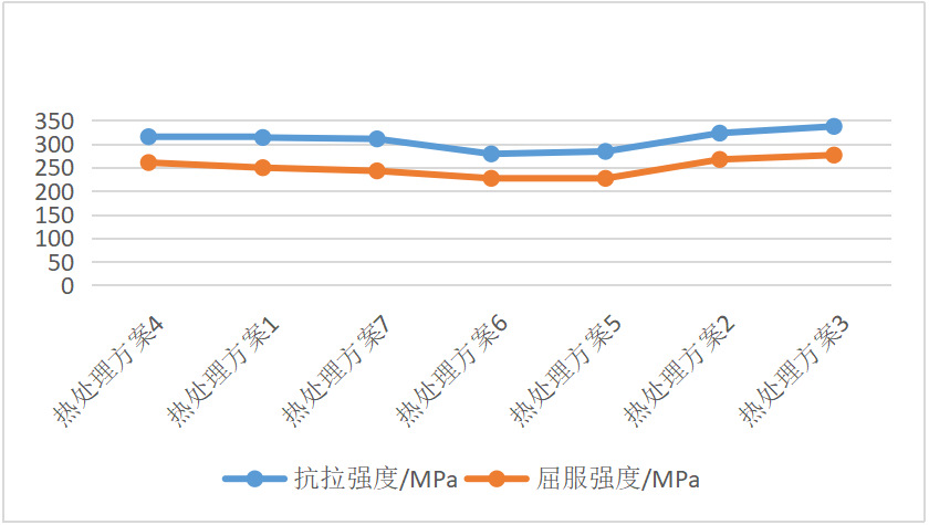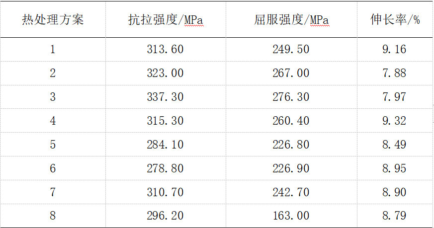 圖4:拉伸試樣示意圖 3.試驗結果及分析 試驗采用的固溶溫度為490、500、510 ℃,保溫3 h,人工時效溫度為170、175、200 ℃時效3 h,分別制定的7種熱處理方案及力學性能數據見表1。