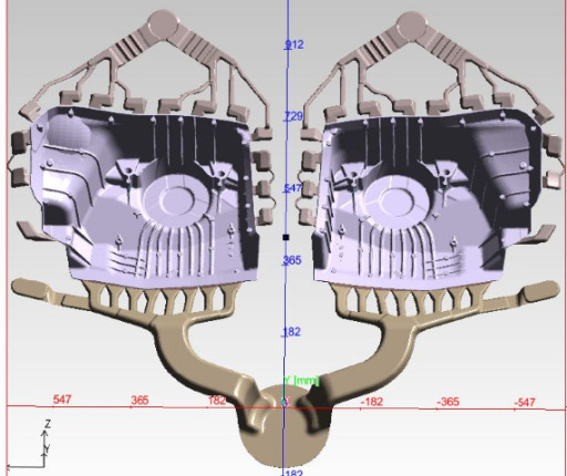 圖1:減震塔的三維示意圖 零件呈左右對稱,單件質量為3.8 kg,平均壁厚為3 mm,外形尺寸為547mm x337mm x318 mm,采用AlSi10MnMg壓鑄鋁合金,投影面積為1802 cm2, 采用意特拉35 000 kN壓鑄機生產(真空度為2 000~2 400 Pa),一模兩腔(左右對稱件各一腔)總投影面積為6226 cm2, 澆注質量為9.27 kg。澆注系統設計見圖2