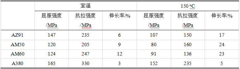 表2:AZ91、AM50、AM60鎂合金和A380鋁合金的力學性能