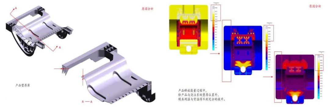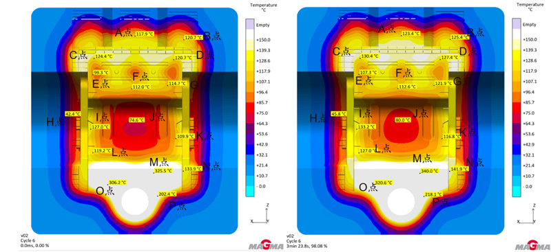 圖9 增加溫控后產品米塞斯應力狀態 3.模具溫度深入分析與改善方向 區別于傳統壓鑄件,大型一體化壓鑄結構件整體壁厚相對平均且較薄,從圖10-1可以觀察到,除模具進澆端和尾端溫度較高外,其余模具地方在合金釋放溫度后僅能達到150°左右,所以就是造成了先天吸收的能量不足。