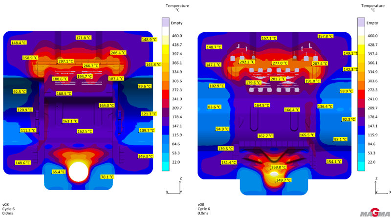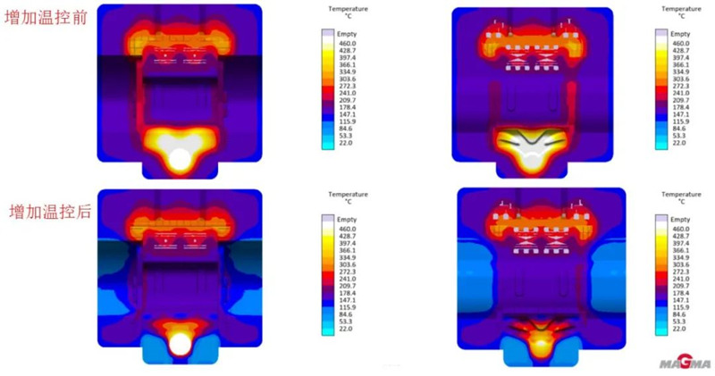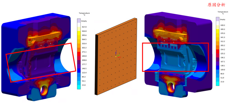 圖4 溫控布置 模擬結果顯示增加溫控后,整體模具溫度得到下降。模具進澆端位置的高溫區域范圍大幅度縮小,最高溫度值也從400°以上下降至400°左右,模具中心及兩側位置,整體溫度相對降低了20-30°,模具尾端溫度變化相對較?。▓D5所示)。
