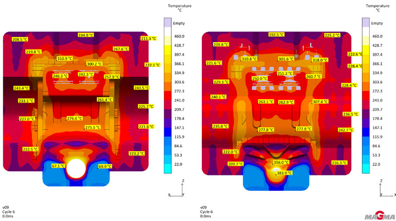 圖6 增加溫控后熱量數據對比 雖然模具整體熱量數值達到平衡后,但如圖7所示,模具整體溫度分布不均衡,進澆端和尾端溫度相對偏高,分別在390°和300°左右,而其余位置模具溫度相對較低,尤其是模具對應產品中間位置和兩側滑塊位置,其溫度分別在160°和100°左右。