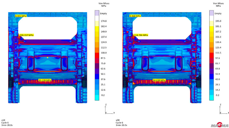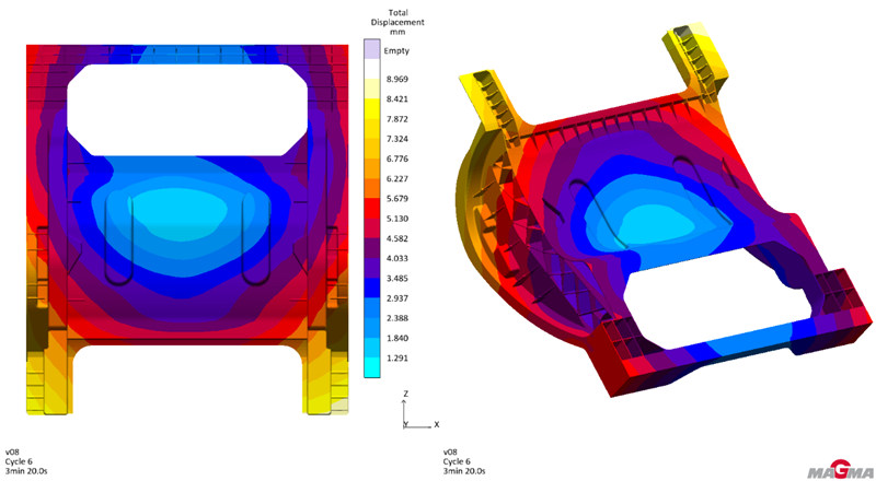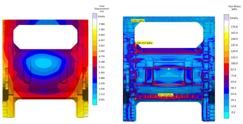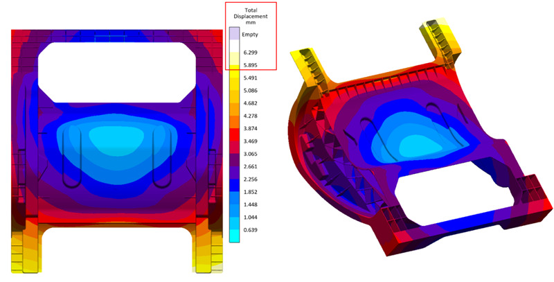 圖7 增加溫控后模具溫度對比 增加空度控制后,整體熱量數值雖幾乎達到平衡,但由于模具溫度場分布不均勻,產品的變形狀態和米塞斯應力分布狀態并沒有得到改善,反而呈現變大的趨勢,產品最大變形位置從7.904mm增大至8.969mm,米塞斯應力最大值從174.8Mpa增加至195Mpa.(圖8,9所示)