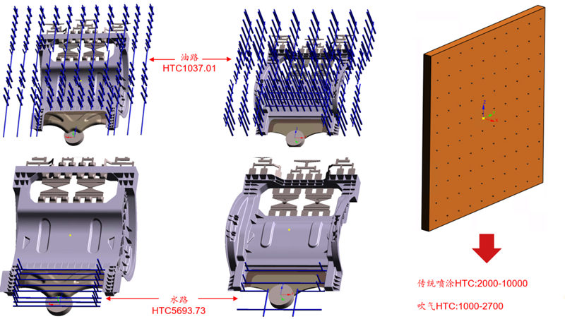 圖3 初始產品變形狀態與米塞斯應力分布狀態 2.增加溫控后的模具溫度與產品應力應變分析 根據初始模擬分析結果,增加溫控系統對模具溫度及熱量平衡進行控制。溫控主要包含了兩個方面,第一方面為模具的油路水路,從模具內部對溫度進行控制,初始油路和水的換熱系數分別為C1037.01和C5693.73;第二方面為通過傳統噴涂對模具表面溫度進行控制,噴涂狀態下換熱系數為C2000-10000,吹氣狀態下換熱系數為1000-2700(圖4所示)。