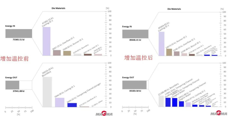 圖5 充型結果分析對比 熱量數據顯示,增加溫控后模具攝入熱量為89,446.41KJ,排溢熱量為83,183.58KJ,相比于之前的幾乎相差一倍多,現在從數量數值角度觀察,基本達到平衡狀態(圖6所示)。
