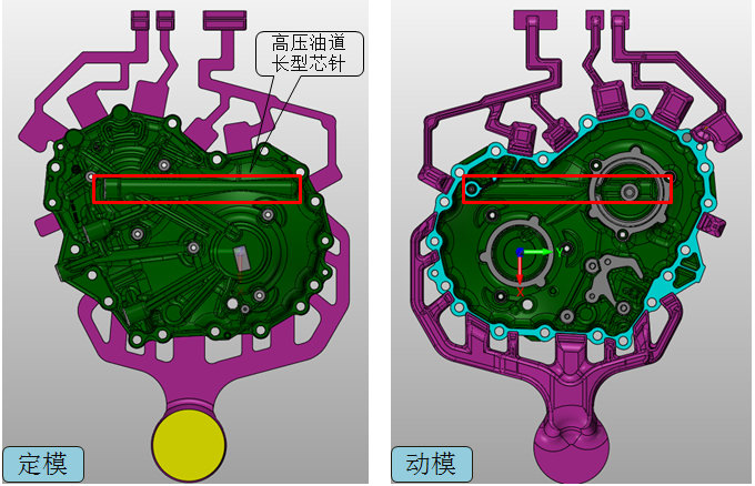 圖4 針套漸變式結(jié)構(gòu) 2.3 長抽芯針高壓點冷冷卻結(jié)構(gòu) 對比研究了長抽芯針有高壓點冷冷卻和無高壓點冷冷卻兩種狀態(tài)下,長抽芯針的變形和偏擺。在其他條件保持不變的情況下,驗證長抽芯針有高壓點冷冷卻和無高壓點冷冷卻狀態(tài)下各壓鑄300模次后長抽芯針外觀情況。結(jié)果發(fā)現(xiàn),長抽芯針有高壓點冷冷卻結(jié)構(gòu),壓鑄300模次之后針的外觀面光潔、無燒傷粘鋁;無高壓點冷冷卻結(jié)構(gòu)壓鑄300模次之后針的外觀面燒傷、粘鋁嚴(yán)重。 采用高壓點冷冷卻結(jié)構(gòu)(見圖5),通過對冷卻時間調(diào)整,可以將抽芯針溫度控制在適宜溫度范圍內(nèi),這樣可以減少此長抽芯針的燒傷、粘鋁,從而減少抽芯針變形和偏擺的可能性,提高抽芯針壽命。