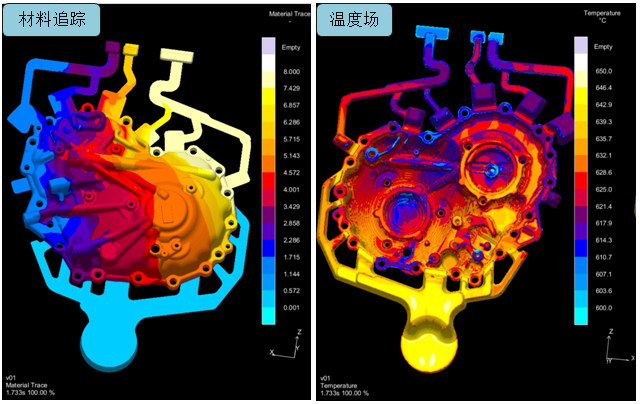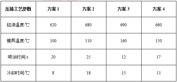 圖2 模流分析 模流分析結(jié)果表明:①按照以上澆注方案,高壓油道長抽芯針在壓鑄成形過程中受到幾股鋁液同時的沖擊作用。根據(jù)受力平衡,只要此長抽芯針定位足夠穩(wěn)定,強(qiáng)度足夠高,可以避免在壓鑄成形過程中由于鋁液對其沖擊而導(dǎo)致的變形和偏擺。②從填充率為100%的溫度場可以看出,高壓油道長抽芯針?biāo)軠囟确植急容^均勻,溫度梯度不明顯。同時生產(chǎn)過程中還可以通過調(diào)節(jié)鋁液溫度、模具溫度、噴涂時間、冷卻時間來削弱溫度場對高壓油道長抽芯針變形和偏擺影響。 1.2 壓鑄工藝參數(shù)選擇 壓鑄工藝參數(shù)對鑄件品質(zhì)非常重要,其中溫度對高壓油道長抽芯針影響最大。當(dāng)溫度過低時,高壓油道長抽芯針?biāo)軆?nèi)外溫差大,鋁液就會對其產(chǎn)生強(qiáng)烈的沖擊,受到?jīng)_擊后很容易變形、開裂受損。當(dāng)有高溫的鋁液注入時,長抽芯針的溫度會迅速上升,進(jìn)行冷卻時,此處鋁液冷卻速度緩慢,導(dǎo)致鑄件會有縮孔、縮松等缺陷出現(xiàn),使鑄件質(zhì)量受到嚴(yán)重的影響。因此控制好高壓油道長抽芯針溫度不僅影響鑄件品質(zhì),而且對其變形和偏擺也有影響。其他條件控制不變,通過調(diào)節(jié)鋁液溫度、模具溫度、噴涂時間、冷卻時間來看鑄件內(nèi)部質(zhì)量以及高壓油道長抽芯針表面燒傷粘鋁。