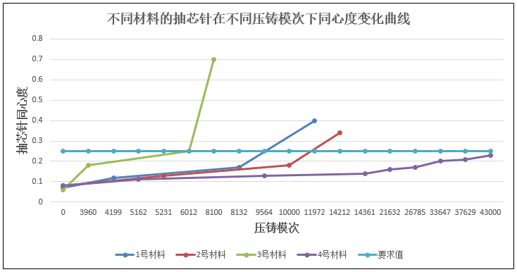 圖5 長抽芯高壓點冷冷卻結(jié)構(gòu) 3、抽芯針材料 不同材料的抽芯針強(qiáng)度不一樣。選用不同材料的抽芯針,在其他條件保持不變的情況下,進(jìn)行壓鑄驗證,記錄并跟蹤抽芯針壓鑄一定模次之后抽芯針的同心度變化情況(見圖6)。1號材料為熱作模具鋼,硬度為HRC 40~50,材料屈服強(qiáng)度為490~685 MPa,抗拉強(qiáng)度為685~985 MPa;2號材料是在1號材料上進(jìn)行改良,保留了1號材料的優(yōu)點,并且得到更好的耐熱裂紋性;3號材料為高速鋼,硬度≥56HRC;4號為特殊熱作模具鋼,硬度為52~57HRC,高硬度,高韌性和極高熱穩(wěn)定性。隨著壓鑄模次增加,從同心度的變化可以看出,1號材料、2號材料、3號材料的抽芯針在壓鑄模次未達(dá)到1.5萬就出現(xiàn)抽芯針同心度大于所要求值0.25。4號材料的抽芯針的同心度隨著壓鑄模次增加穩(wěn)定較好,且壓鑄模次達(dá)到4.3萬模次,同心度仍小于所有要求值0.25。說明4號材料的抽芯針在其壓鑄過程中變形較小。為了更好杜絕長抽芯針變形,選用4號材料的抽芯針,同時抽芯針壽命收嚴(yán)至3萬模次管控,且每次上模壓鑄前均需要打表測量抽芯針的同心度。