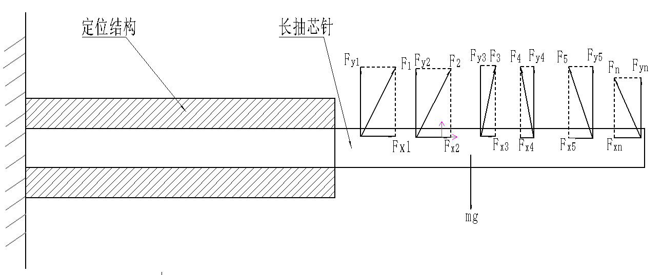 圖7 抽芯針受力數(shù)學(xué)模型 多點進(jìn)澆方式,鋁液溫度為660 ℃,模具溫度為150 ℃,噴涂時間為17 s,冷卻時間為11 s對抽芯針變形和偏擺影響不明顯。抽芯針采用T型連接、定位塊定位和采用高壓點冷冷卻,研發(fā)出長抽芯針與針套配合段分段式結(jié)構(gòu),減少抽芯針與針套磨損,減少抽芯針變形和偏擺的可能性。W360材料抽芯針強(qiáng)度可滿足此抽芯針實際所需承受的力,減少抽芯針變形和偏擺的可能性。 4、結(jié)語 按照以上壓鑄生產(chǎn)工藝、模具結(jié)構(gòu)、采用W360材料抽芯針,我司變速箱側(cè)蓋高壓油道長抽芯針未出現(xiàn)變形和偏擺導(dǎo)致油道孔壁厚問題。