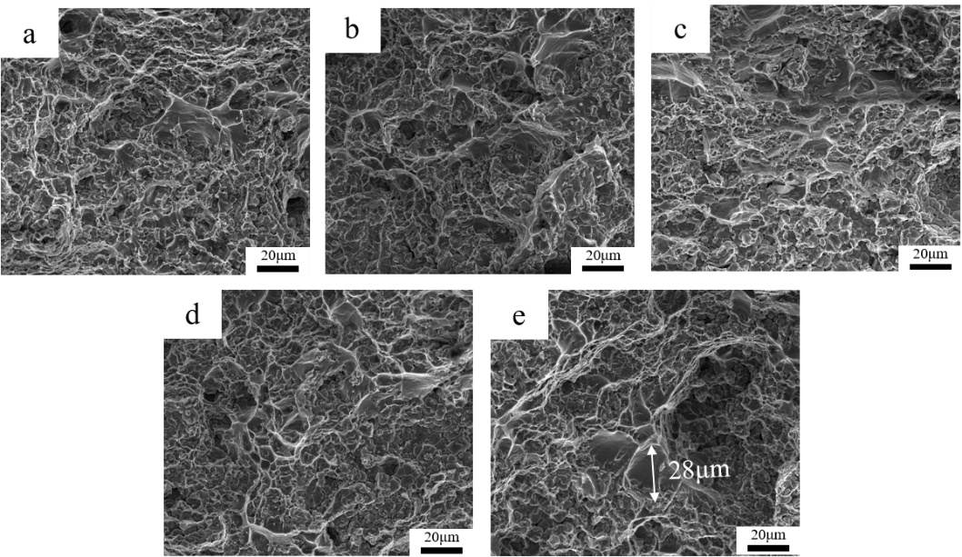 圖4 不同增壓比壓下試樣斷口典型形貌: 圖 4為不同增壓比壓流變壓鑄制備出的Al-Zn-Mg-Cu合金試樣熱裂斷口形貌。可知試樣的斷口表面均有著縮孔缺陷分布,斷面平整度不高。隨著增壓比壓增加,縮孔由試樣中心逐漸向外擴展,且縮孔大小有顯著的變化。當比壓小于81 MPa時,斷口中心區域分布著較大的縮孔,在81 MPa時,斷口中心區域表現為疏松,縮孔主要分布在斷口截面徑向0.5R區域范圍;大于81 MPa時,斷口中心區域已經不能明顯看到組織疏松的存在,且縮孔大小進一步降低。此外,在所有的斷口邊緣區域,可見有較為平整的斷面區域,組織也較為均勻致密。