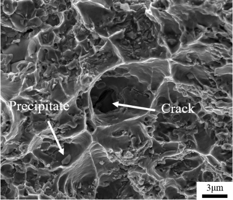 圖9 韌窩微觀形貌 熱裂在宏觀上表現為脆性斷裂(圖 4),但在靠近試樣斷口邊緣出現塑性變形,出現韌窩(見圖 8)。因此將Al-Zn-Mg-Cu合金流變壓鑄件斷裂分為三個階段,見圖 10: I階段在試樣的中心區域,也是裂紋源的主要發生部位,呈現出脆性斷裂特征。其形成主要受試樣心部補縮不足影響,尤其在增壓比壓較小時,形成大的縮孔并導致裂紋源的形成和擴展;Stage II階段為脆-韌斷裂相結合,該區域為斷裂的過渡階段;Stage III為韌性斷裂階段,該區域靠近試樣表層,晶粒組織細小均勻,有著更好的韌性,因此在斷裂面出現韌窩。該階段也是斷裂的最后階段,應為到達臨界值時的瞬間斷裂。晶界的結合強度是影響裂紋擴展的主要因素,析出的富Fe相會弱化晶界,促進裂紋擴展,提高熱裂可能性。