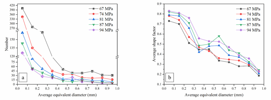圖12 不同增壓比壓下Al-Zn-Mg-Cu合金流變壓鑄件孔隙率統計 圖 13為不同增壓比壓下Al-Zn-Mg-Cu合金流變壓鑄件斷裂試樣平行段及過渡段孔洞的數量及形狀因子與等效直徑變化的關系曲線。從圖 13a可知,在不同的增壓比壓下,孔洞的數量在整體上隨著等效直徑的增大而減小,孔洞的數量在等效直徑低于0.4 mm時較多,數量達數百個。當等效直徑超過0.4 mm時,孔洞的數量急劇減少,均低于50,且隨著等效直徑的增大孔洞數量呈整體下降的趨勢。在相同的孔洞等效直徑下,隨著增壓比壓增加,孔洞的數量逐漸減少。在孔洞的等效直徑低于0.4 mm時,提高增壓比壓對減少孔洞數量效果十分顯著,高于0.4 mm時孔洞的數量減少有所放緩。圖 13b可以看出,不同增壓比壓下孔洞的形狀因子隨等效直徑的增加而降低,且整體上形狀因子的變化十分劇烈。在等效直徑高于0.6 mm時,不同增壓比壓的鑄件試樣孔洞的形狀因子都低于0.5。
