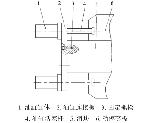 圖4 分流錐及分體熔杯結構 2.4 抽芯油缸的設計 由于液壓抽芯機構可以實現抽拔阻力大、抽芯行程長的特點,因此大型壓鑄模的滑塊一般采用液壓抽芯機構。大型壓鑄模的結構特點決定了滑塊會出現尺寸大、抽芯行程大兩種情況,針對這兩種情況,可以對抽芯油缸的結構進行以下優化。 滑塊在分型面方向尺寸大,采用雙油缸抽芯。雙油缸抽芯結構如圖5所示,兩側油缸活塞桿4固定在套板上,油缸缸體1固定在油缸連接板2上。工作時活塞桿4固定不動,油缸缸體1通過油缸連接板2帶動滑塊運動。當前端無桿腔進油,油缸帶動滑塊抽芯;反之,有桿腔進油,油缸帶動滑塊插芯。模具采用雙油缸結構,不僅可以減小油缸直徑,更重要的雙側受力滑塊運行更穩定。